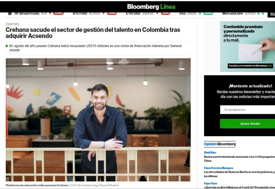 La compañía peruana de gestión del aprendizaje Crehana fortalece su posición en Colombia tras adquirir a la firma local de gestión de recursos humanos Acsendo, confirmaron a Bloomberg Línea fuentes cercanas a la empresa que hizo la adquisición.