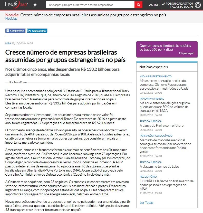 Uma pesquisa encomendada pelo jornal O Estado de S. Paulo para a Transactional Track Record (TTR) identificou que, de janeiro de 2014 a agosto de 2018, quase 400 empresas brasileiras foram transferidas para o controle de grupos internacionais no país. Eles tiveram que desembolsar R$ 133,2 bilhões para adquirir participações em companhias locais.