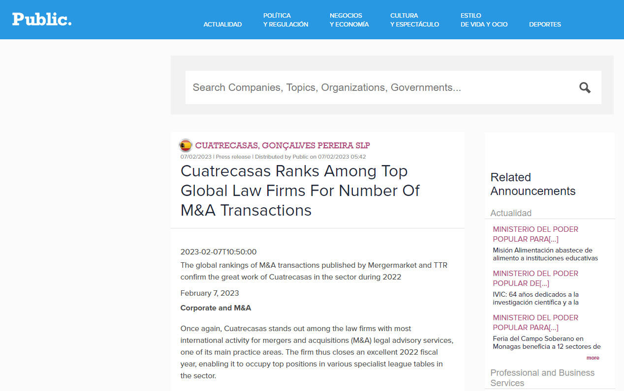 Cuatrecasas Ranks Among Top Global Law Firms For Number Of M&A Transactions