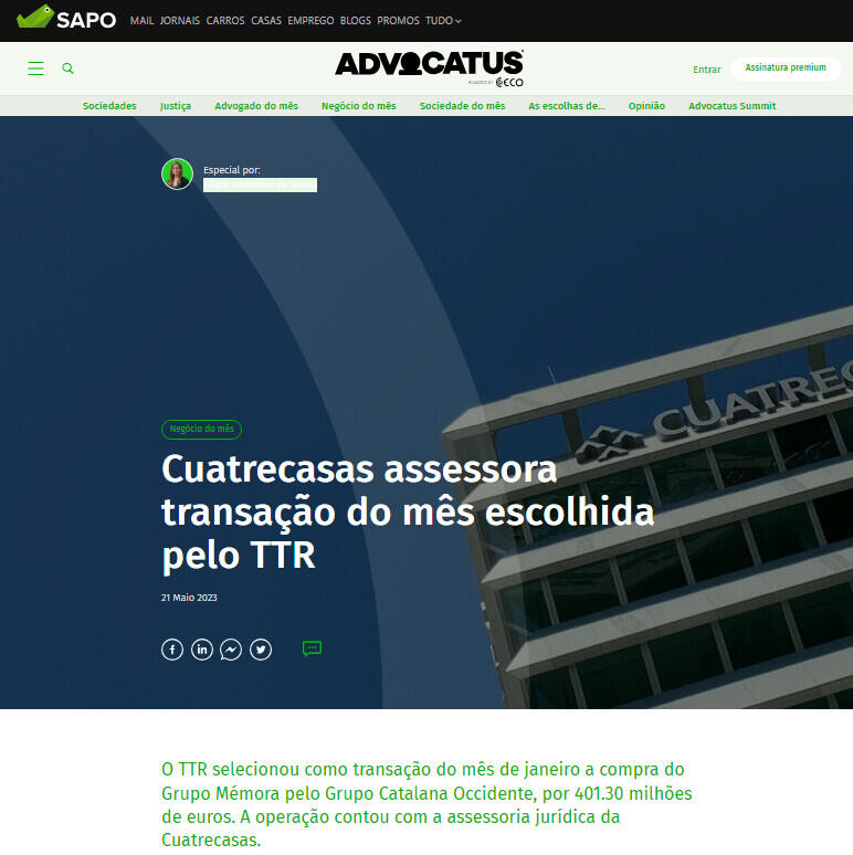 O TTR selecionou como transação do mês de janeiro a compra do Grupo Mémora pelo Grupo Catalana Occidente, por 401.30 milhões de euros. A operação contou com a assessoria jurídica da Cuatrecasas.