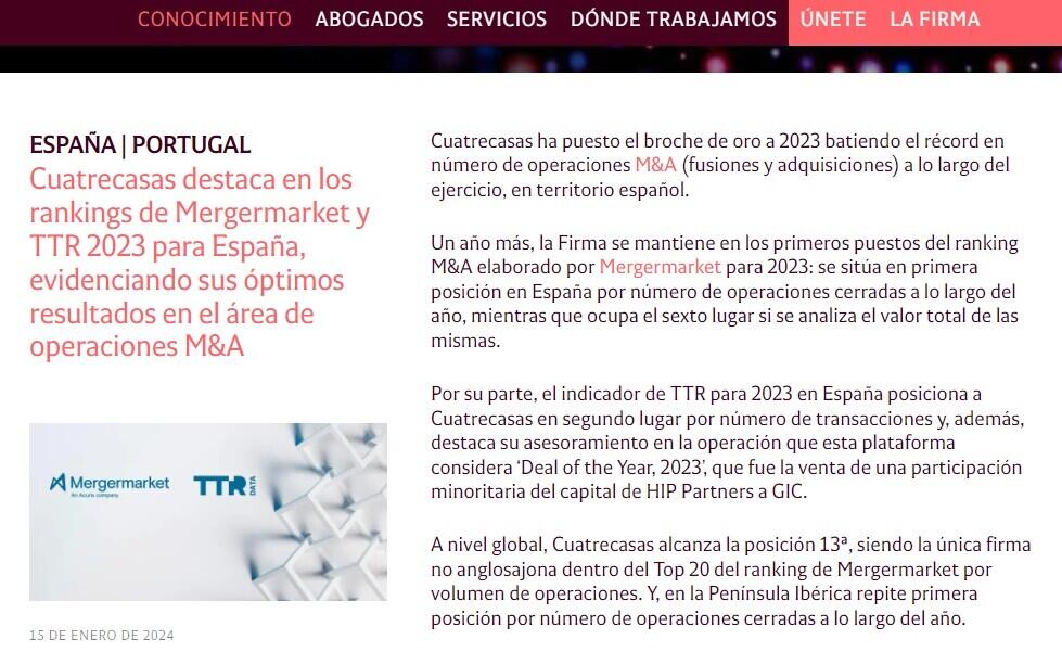 Por su parte, el indicador de TTR para 2023 en España posiciona a Cuatrecasas en segundo lugar por número de transacciones y, además, destaca su asesoramiento en la operación que esta plataforma considera ‘Deal of the Year, 2023’, que fue la venta de una participación minoritaria del capital de HIP Partners a GIC.