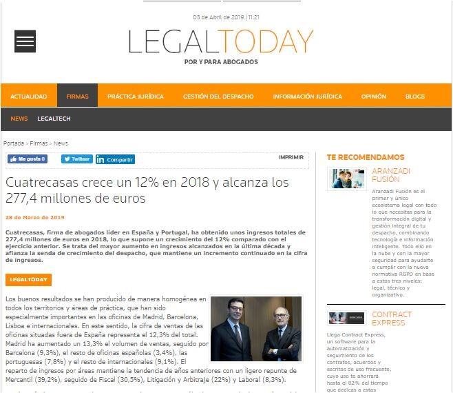 Cuatrecasas, firma de abogados líder en España y Portugal, ha obtenido unos ingresos totales de 277,4 millones de euros en 2018, lo que supone un crecimiento del 12% comparado con el ejercicio anterior. Se trata del mayor aumento en ingresos alcanzados en la última década y afianza la senda de crecimiento del despacho, que mantiene un incremento continuado en la cifra de ingresos.