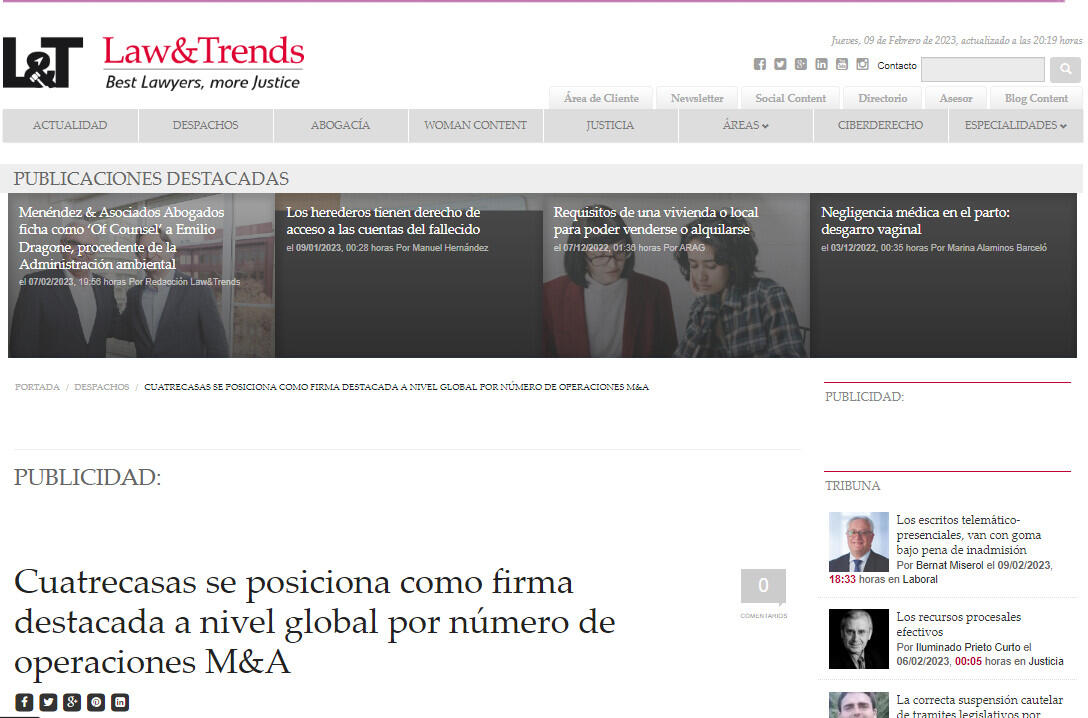 Cuatrecasas se posiciona como firma destacada a nivel global por número de operaciones M&A