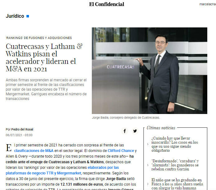 El primer semestre de 2021 ha cerrado con sorpresa al frente de las clasificaciones de M&A en el sector legal. El dominio de Clifford Chance y Allen & Overy —durante todo 2020 y los tres primeros meses de este año— ha cedido ante el empuje de Cuatrecasas y Latham & Watkins, despachos que lideran los 'rankings' por valor de las operaciones elaborados por las plataformas de negocio TTR y Mergermarket, respectivamente. Según los datos a 30 de junio del presente ejercicio, la firma que dirige Jorge Badía selló transacciones por un importe de 12.131 millones de euros, de acuerdo con los criterios de valoración de TTR. La organización que encabeza Ignacio Gómez-Sancha, por su parte, asesoró en acuerdos que suman en total 14.554 millones, según Mergermarket.