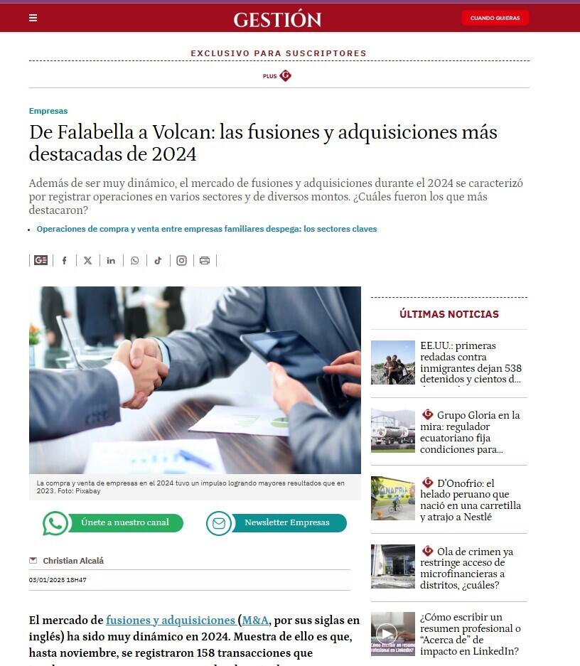 El mercado de Fusiones y Adquisiciones ha sido muy dinámico en 2024. Muestra de ello es que, hasta noviembre, se registraron 158 transacciones que involucran empresas peruanas en donde se incluyen operaciones de M&A, adquisicón de activos, Private Equity y Venture Capital. Esa cifra super un 18,8%lo registrado en similar periodo de 2023, según la consultora TTR.