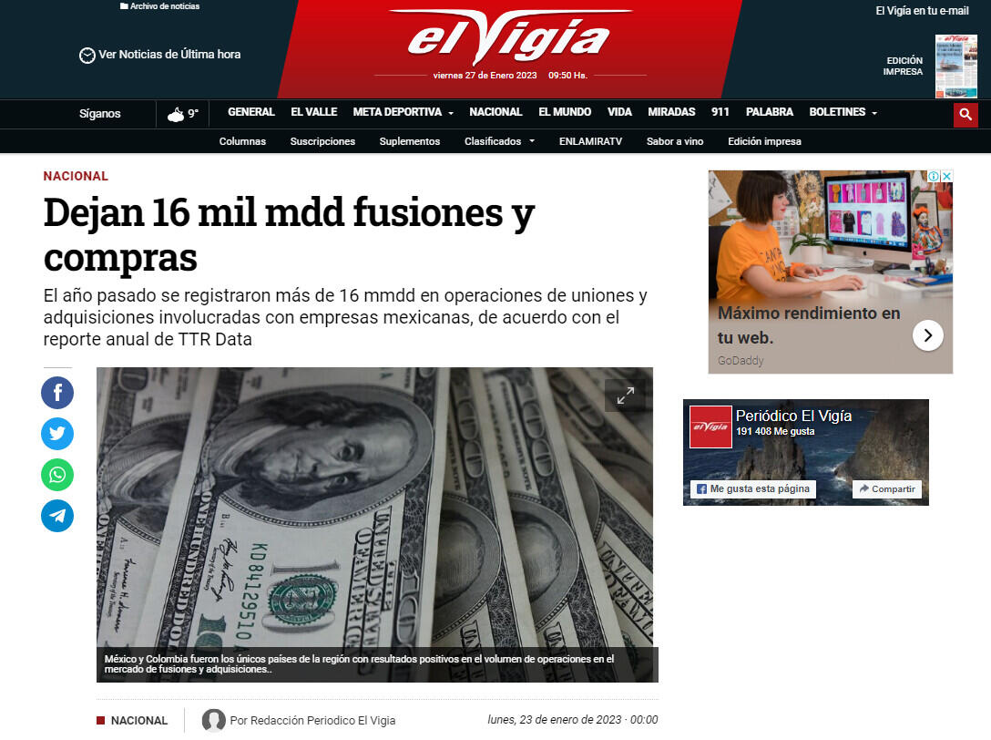 El año pasado se registraron más de 16 mmdd en operaciones de uniones y adquisiciones involucradas con empresas mexicanas, de acuerdo con el reporte anual de TTR Data