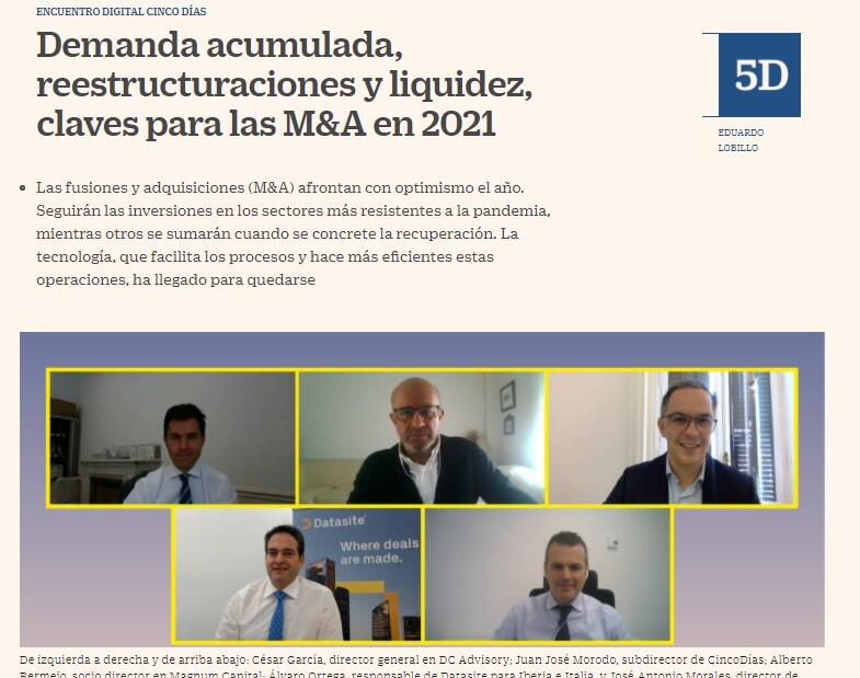 “Somos muy positivos para 2021”, añade César García, director general de DC Advisory. “Estamos en un momento excelente para aquellos que han resistido bien la crisis, con abundante liquidez en el sistema y tipos de interés al cero”.