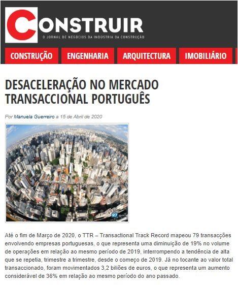Até o fim de Março de 2020, o TTR – Transactional Track Record mapeou 79 transacções envolvendo empresas portuguesas, o que representa uma diminuição de 19% no volume de operações em relação ao mesmo período de 2019, interrompendo a tendência de alta que se repetia, trimestre a trimestre, desde o começo de 2019. Já no tocante ao valor total transaccionado, foram movimentados 3,2 biliões de euros, o que representa um aumento considerável de 36% em relação ao mesmo período do ano passado.