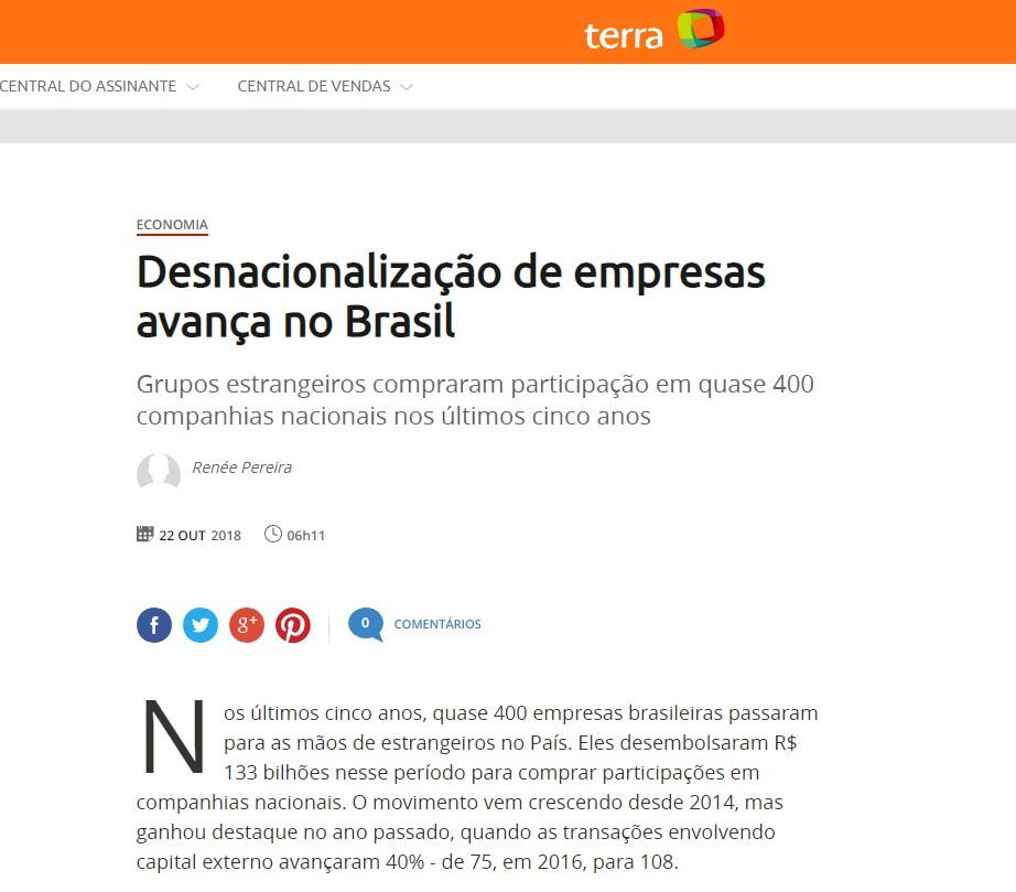 Ele lembra que empresas importantes para a economia brasileira caíram na Lava Jato e foram obrigadas a vender ativos para pagar dívidas - a exemplo de Odebrecht que se desfez de vários negócios, como a Odebrecht Ambiental, vendida para a canadense Brookfield. "Na recessão, quem tinha dinheiro para marcar território eram os estrangeiros."