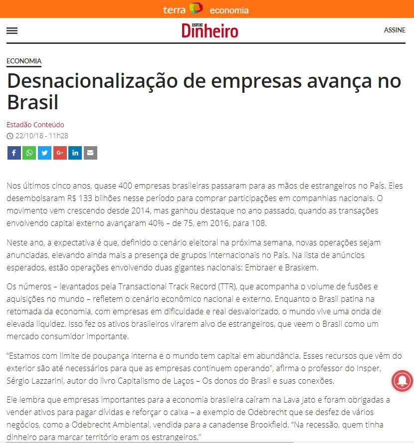 Desnacionalização de empresas avança no Brasil