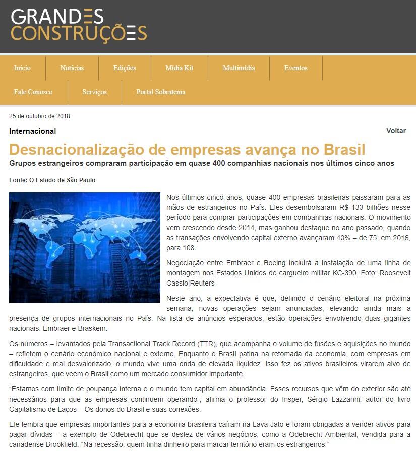 Ele lembra que empresas importantes para a economia brasileira caíram na Lava Jato e foram obrigadas a vender ativos para pagar dívidas – a exemplo de Odebrecht que se desfez de vários negócios, como a Odebrecht Ambiental, vendida para a canadense Brookfield. “Na recessão, quem tinha dinheiro para marcar território eram os estrangeiros.”