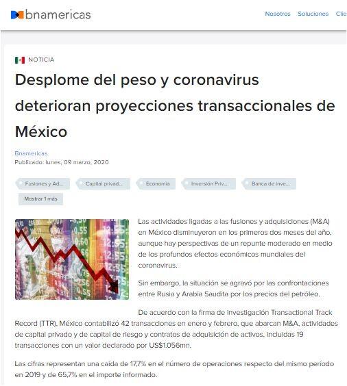 "Si continúa el entorno actual, creado por la constante devaluación [sic] del peso mexicano, los repentinos precios del petróleo, y sumado a la incertidumbre generada por el coronavirus, podría representar otro reto para 2020 en el mercado M&A mexicano", agregó