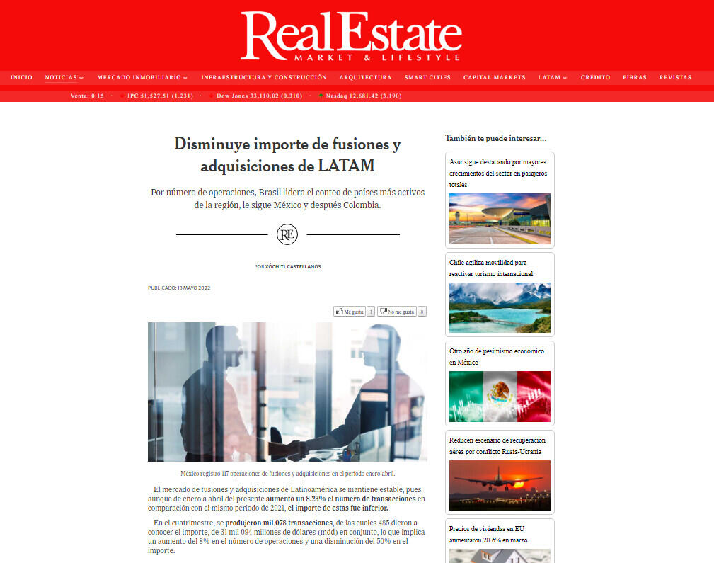 El mercado de fusiones y adquisiciones de Latinoamérica se mantiene estable, pues aunque de enero a abril del presente aumentó un 8.23% el número de transacciones en comparación con el mismo periodo de 2021, el importe de estas fue inferior.