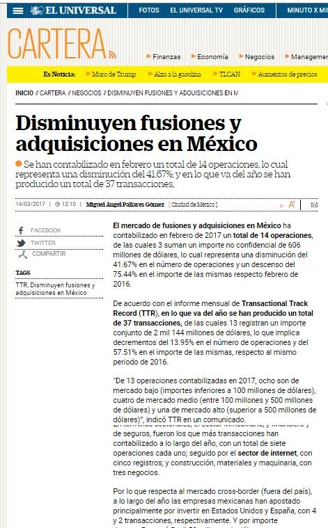 El mercado de fusiones y adquisiciones en México ha contabilizado en febrero de 2017 un total de 14 operaciones, de las cuales 3 suman un importe no confidencial de 606 millones de dólares, lo cual representa una disminución del 41,67% en el número de operaciones y un descenso del 75,44% en el importe de las mismas respecto febrero de 2016.