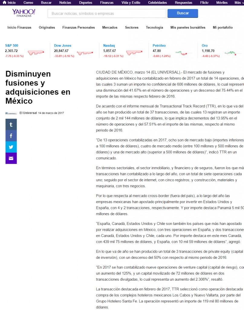 El mercado de fusiones y adquisiciones en México ha contabilizado en febrero de 2017 un total de 14 operaciones, de las cuales 3 suman un importe no confidencial de 606 millones de dólares, lo cual representa una disminución del 41.67% en el número de operaciones y un descenso del 75.44% en el importe de las mismas respecto febrero de 2016.
