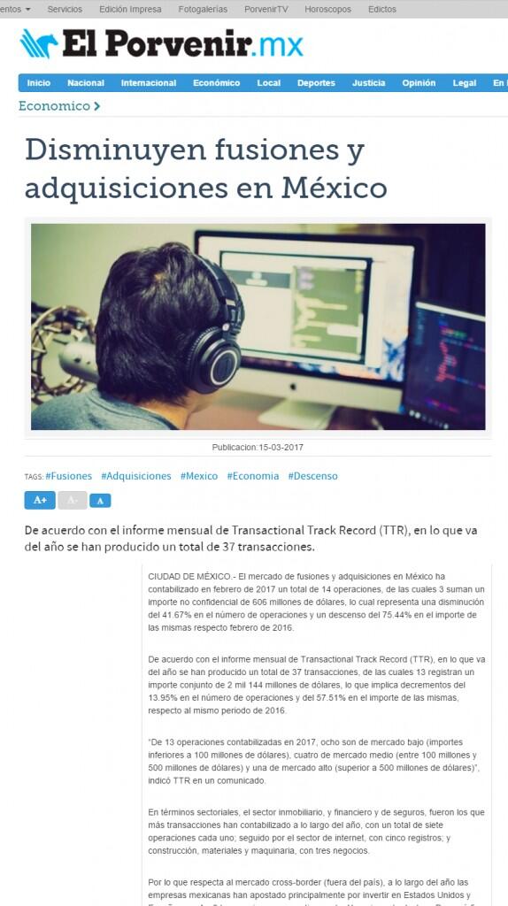 De acuerdo con el informe mensual de Transactional Track Record (TTR), en lo que va del año se han producido un total de 37 transacciones, de las cuales 13 registran un importe conjunto de 2 mil 144 millones de dólares, lo que implica decrementos del 13.95% en el número de operaciones y del 57.51% en el importe de las mismas, respecto al mismo periodo de 2016.