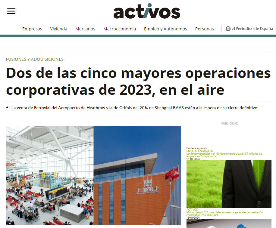 La venta de Ferrovial del Aeropuerto de Heathrow y la de Grifols del 20% de Shanghai RAAS están a la espera de su cierre definitivo