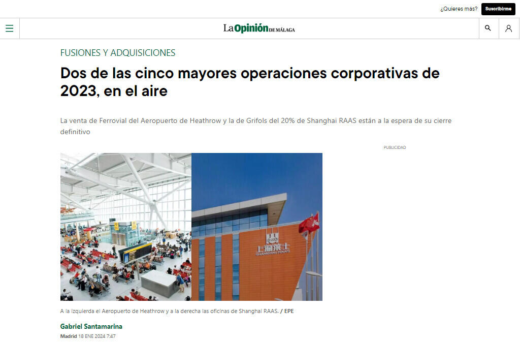 La venta de Ferrovial del Aeropuerto de Heathrow y la de Grifols del 20% de Shanghai RAAS están a la espera de su cierre definitivo
