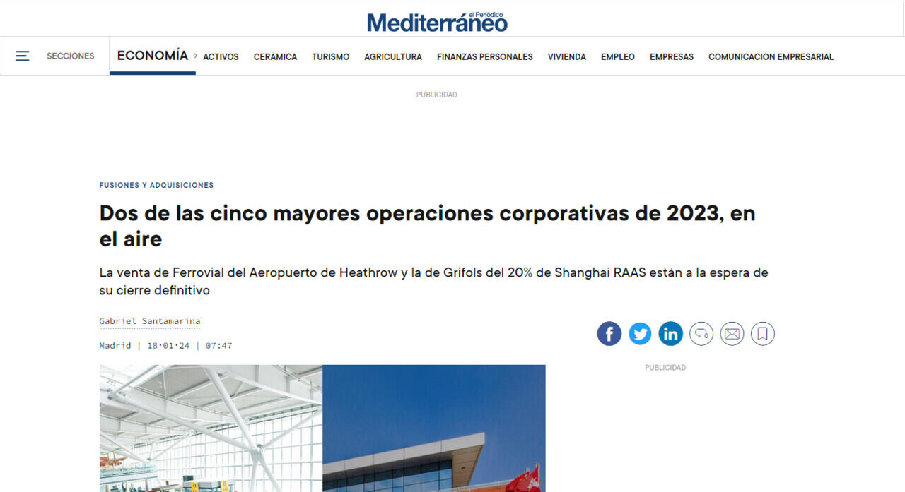 La venta de Ferrovial del Aeropuerto de Heathrow y la de Grifols del 20% de Shanghai RAAS están a la espera de su cierre definitivo