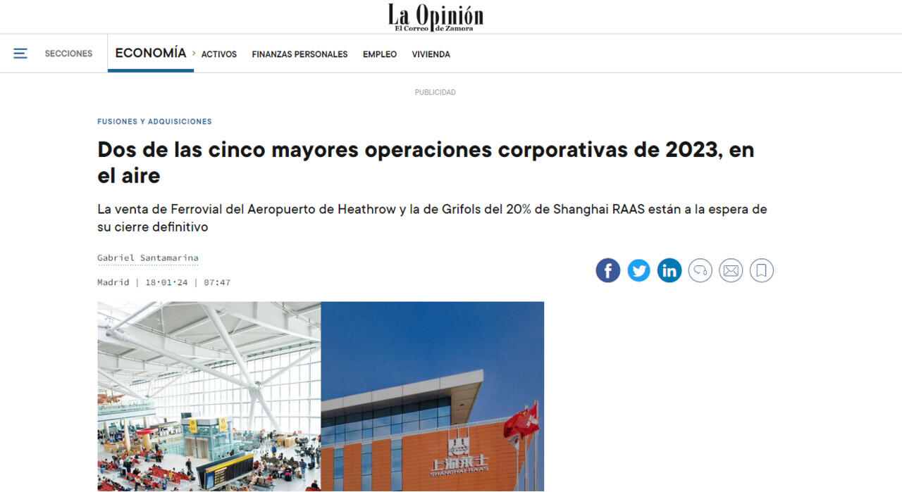La venta de Ferrovial del Aeropuerto de Heathrow y la de Grifols del 20% de Shanghai RAAS están a la espera de su cierre definitivo