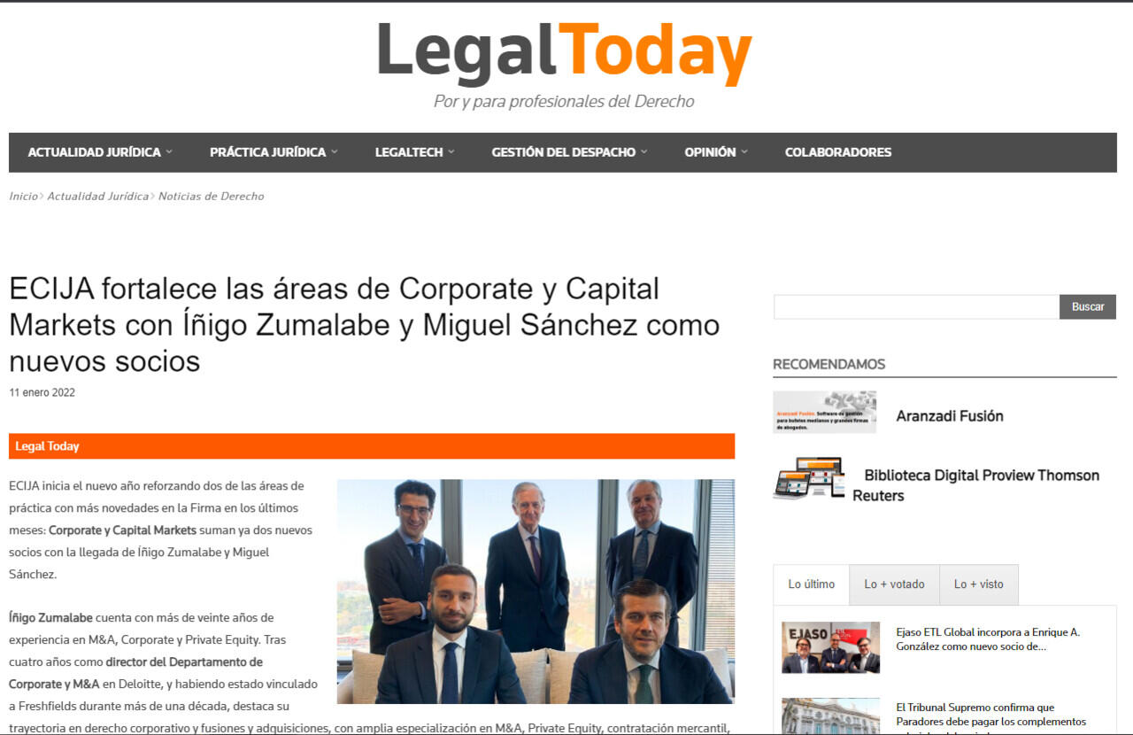 ECIJA inicia el nuevo año reforzando dos de las áreas de práctica con más novedades en la Firma en los últimos meses: Corporate y Capital Markets suman ya dos nuevos socios con la llegada de Íñigo Zumalabe y Miguel Sánchez.