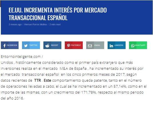 Estados Unidos , históricamente considerado como el primer país extranjero que más inversiones realiza en el mercado M&A de España , ha incrementado su interés por el mercado transaccional español en los cinco primeros meses de 2017, según datos recientes de TTR . Este comportamiento queda patente, tanto en el número de operaciones llevadas a cabo, el cual se ha incrementado en un 57,14%, como en el importe de las mismas, con un crecimiento del 171,78%, respecto al mismo periodo del año 2016.