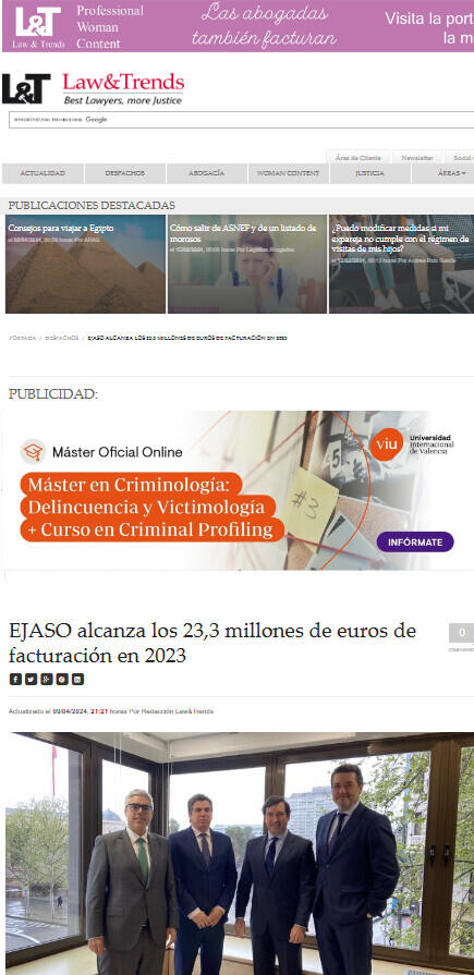 Ejaso, despacho especializado en la abogacía de los negocios para el middle market, ha alcanzado los 23,3 millones de euros de facturación en 2023, un 7,4% más que el año anterior, cuando llegaron a los 21,7 millones de euros. La firma ha duplicado su cifra de negocio en tan solo 7 años.