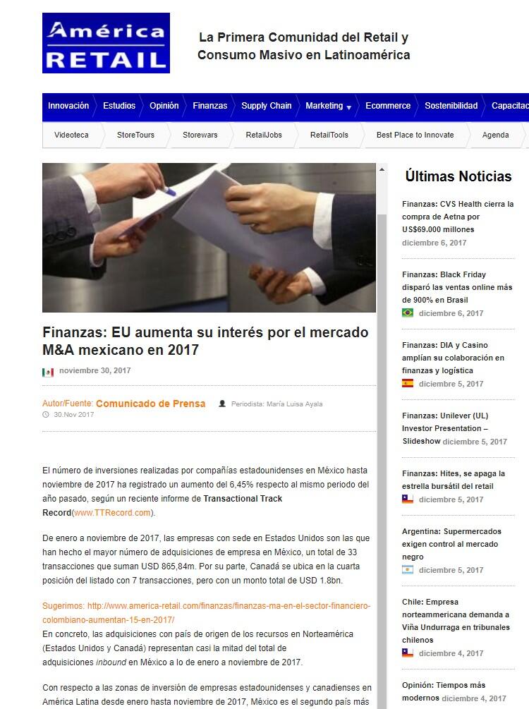 Con respecto a las zonas de inversión de empresas estadounidenses y canadienses en América Latina desde enero hasta noviembre de 2017, México es el segundo país más destacado después de Brasil, con 83 transacciones, seguido por Chile y Colombia, con 25 operaciones en cada país.
