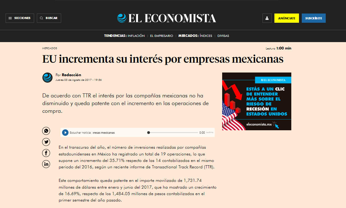 De acuerdo con TTR el interés por las compañías mexicanas no ha disminuido y queda patente con el incremento en las operaciones de compra.