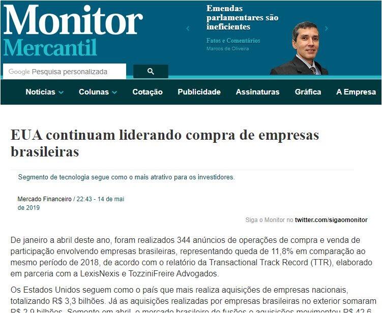 De janeiro a abril deste ano, foram realizados 344 anúncios de operações de compra e venda de participação envolvendo empresas brasileiras, representando queda de 11,8% em comparação ao mesmo período de 2018, de acordo com o relatório da Transactional Track Record (TTR), elaborado em parceria com a LexisNexis e TozziniFreire Advogados.