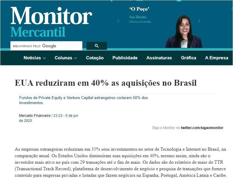 As empresas estrangeiras reduziram em 35% seus investimentos no setor de Tecnologia e Internet no Brasil, na comparação anual. Os Estados Unidos diminuíram suas aquisições em 40%, mesmo assim, ainda são o investidor mais ativo no país com 29 transações até o fim de maio. Os dados são do relatório de maio do TTR (Transactional Track Record), plataforma de desenvolvimento de negócio e pesquisa de transações que fornece conteúdo para empresas privadas e listadas que fazem negócios na Espanha, Portugal, América Latina e Caribe.