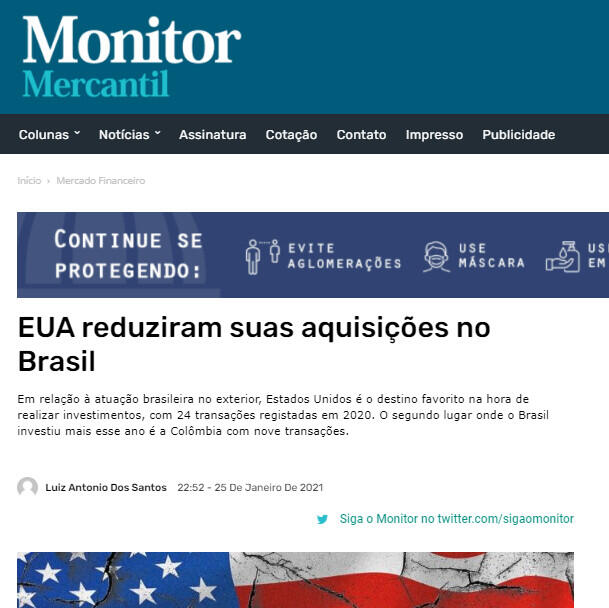 Em relação à atuação brasileira no exterior, Estados Unidos é o destino favorito na hora de realizar investimentos, com 24 transações registadas em 2020. O segundo lugar onde o Brasil investiu mais esse ano é a Colômbia com nove transações.