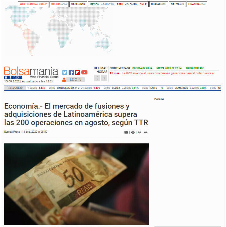 Economía.- El mercado de fusiones y adquisiciones de Latinoamérica supera las 200 operaciones en agosto, según TTR