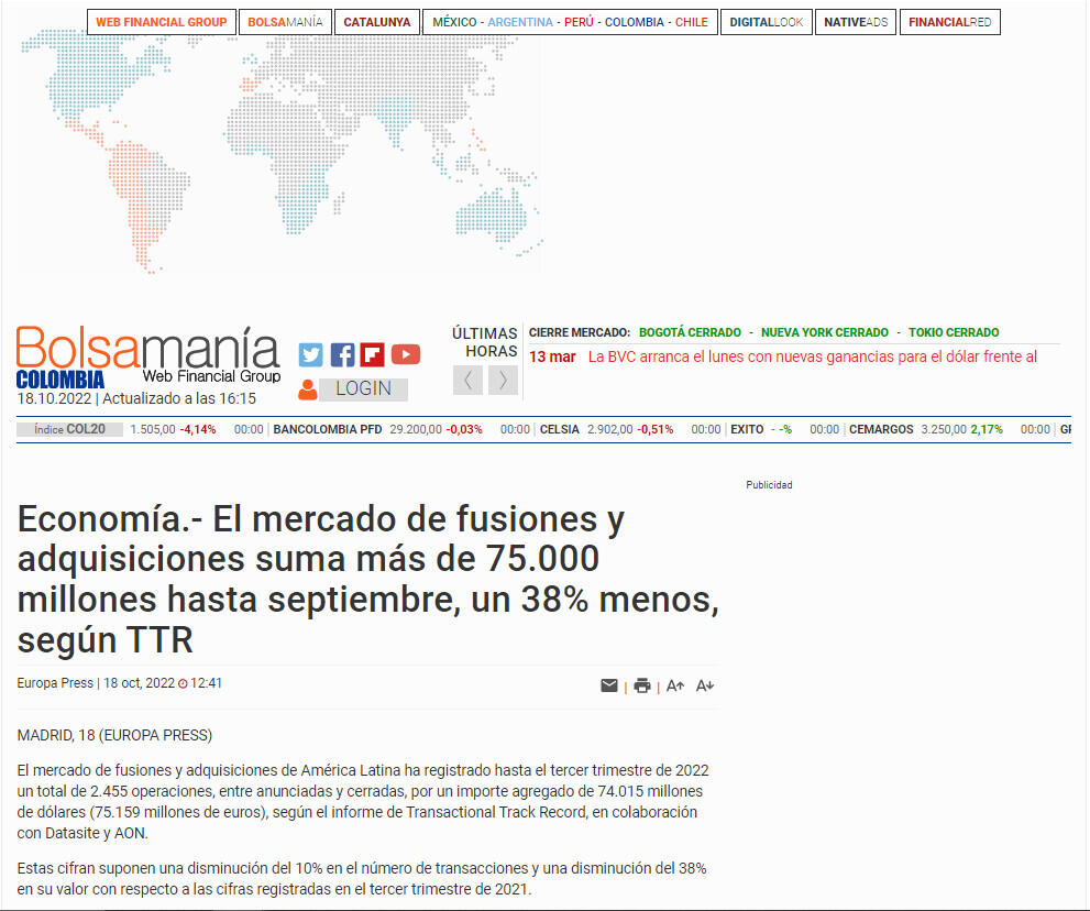 El mercado de fusiones y adquisiciones de América Latina ha registrado hasta el tercer trimestre de 2022 un total de 2.455 operaciones, entre anunciadas y cerradas, por un importe agregado de 74.015 millones de dólares (75.159 millones de euros), según el informe de Transactional Track Record, en colaboración con Datasite y AON.