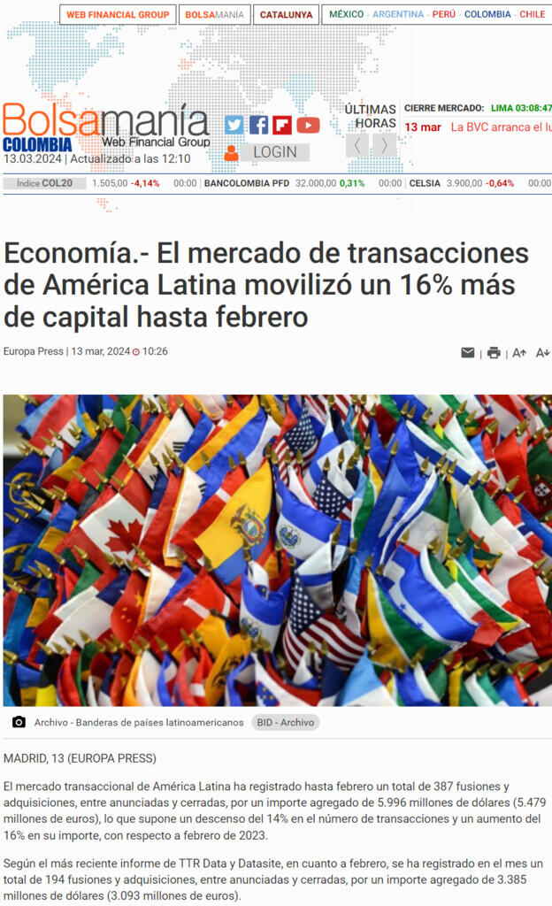 El mercado transaccional de América Latina ha registrado hasta febrero un total de 387 fusiones y adquisiciones, entre anunciadas y cerradas, por un importe agregado de 5.996 millones de dólares (5.479 millones de euros), lo que supone un descenso del 14% en el número de transacciones y un aumento del 16% en su importe, con respecto a febrero de 2023.