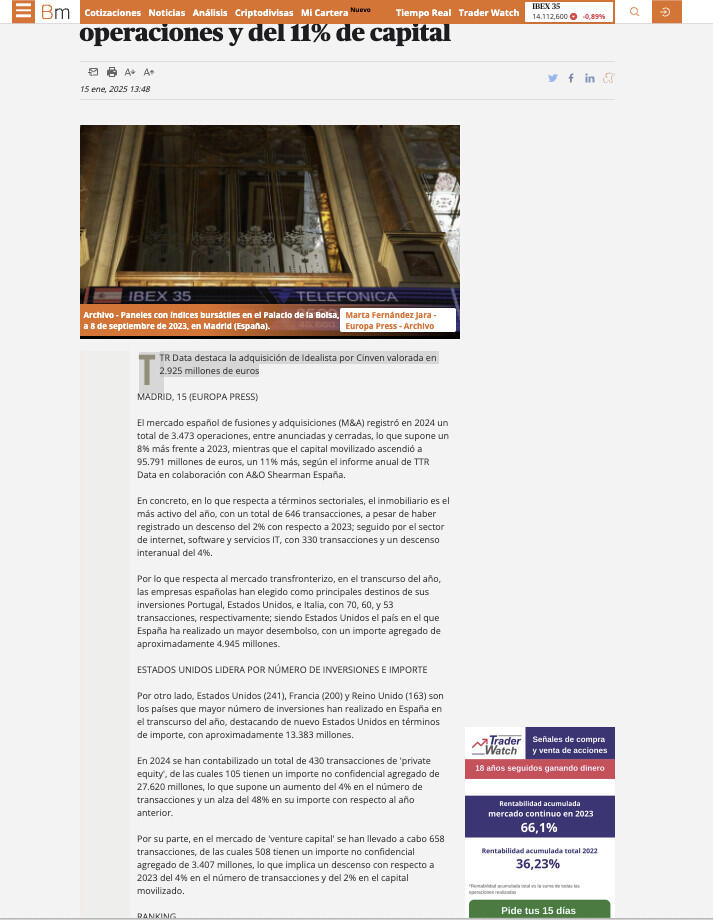 En el mercado de adquisición de activos, se han cerrado en el año 915 transacciones con un importe de 15.772 millones de euros, lo que supone un aumento del 2% en el número de transacciones y del 61% en su importe con respecto a 2023. Para 2024, TTR Data ha seleccionado como transacción destacada la adquisición de Idealista por parte de Cinven.