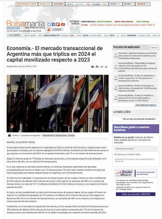 Economía.- El mercado transaccional de Argentina más que triplica en 2024 el capital movilizado respecto a 2023