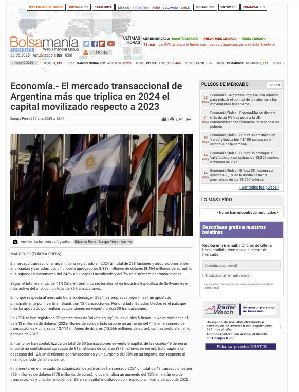 El mercado transaccional argentino ha registrado en 2024 un total de 238 fusiones y adquisiciones entre anunciadas y cerradas, por un importe agregado de 8.833 millones de dólares (8.464 millones de euros), lo que supone un incremento del 246% en el capital movilizado y del 7% en el número de transacciones.
