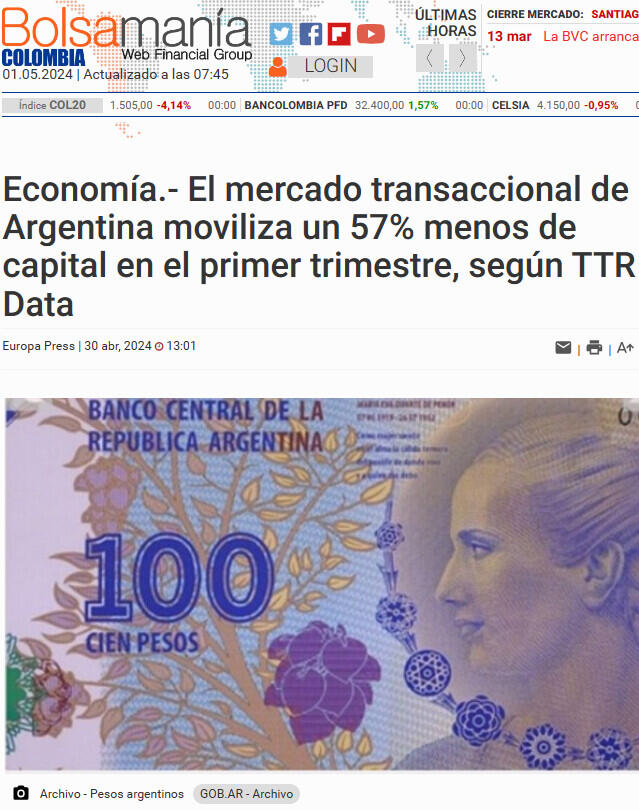 Economía.- El mercado transaccional de Argentina moviliza un 57% menos de capital en el primer trimestre, según TTR Data