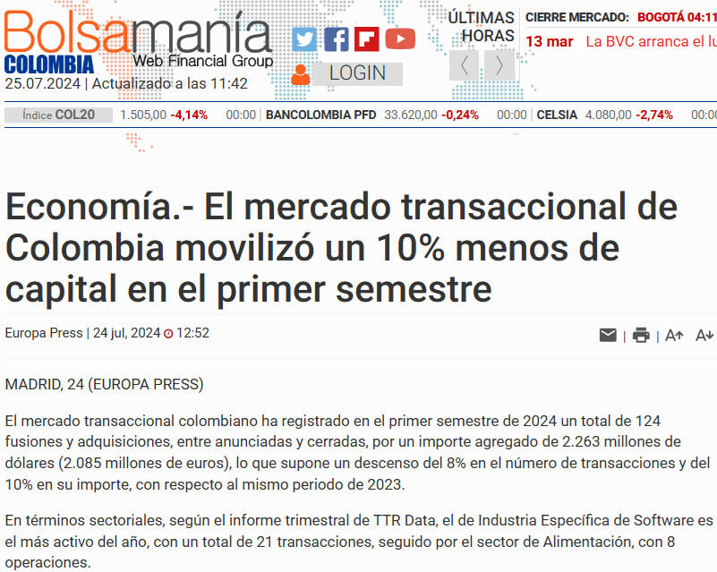 El mercado transaccional colombiano ha registrado en el primer semestre de 2024 un total de 124 fusiones y adquisiciones, entre anunciadas y cerradas, por un importe agregado de 2.263 millones de dólares (2.085 millones de euros), lo que supone un descenso del 8% en el número de transacciones y del 10% en su importe, con respecto al mismo periodo de 2023.