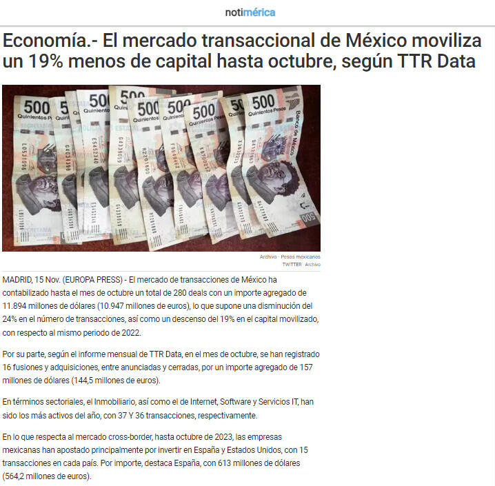 Por su parte, según el informe mensual de TTR Data, en el mes de octubre, se han registrado 16 fusiones y adquisiciones, entre anunciadas y cerradas, por un importe agregado de 157 millones de dólares (144,5 millones de euros).