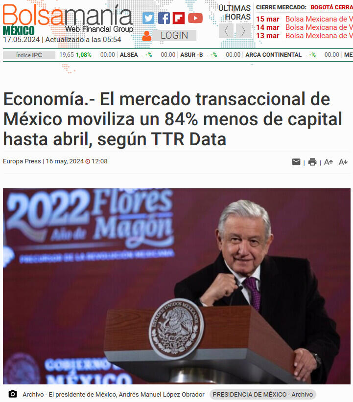Economía.- El mercado transaccional de México moviliza un 84% menos de capital hasta abril, según TTR Data