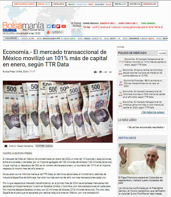 Economía.- El mercado transaccional de México movilizó un 101% más de capital en enero, según TTR Data