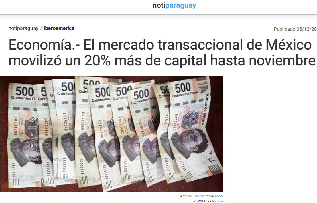 Economía.- El mercado transaccional de México movilizó un 20% más de capital hasta noviembre