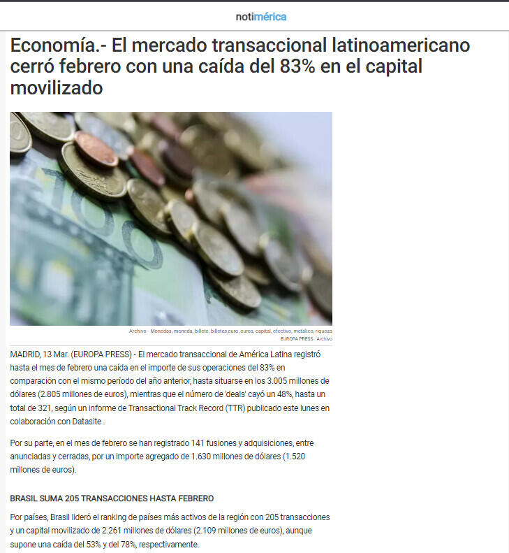 MADRID, 13 Mar. (EUROPA PRESS) - El mercado transaccional de América Latina registró hasta el mes de febrero una caída en el importe de sus operaciones del 83% en comparación con el mismo período del año anterior, hasta situarse en los 3.005 millones de dólares (2.805 millones de euros), mientras que el número de 'deals' cayó un 48%, hasta un total de 321, según un informe de Transactional Track Record (TTR) publicado este lunes en colaboración con Datasite .