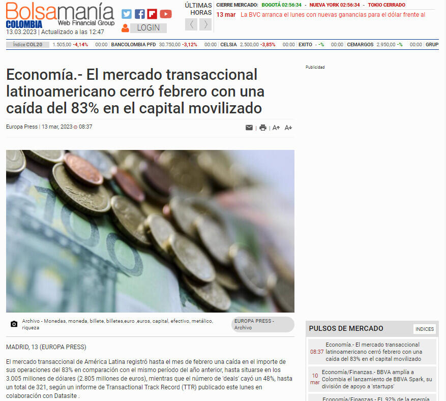 Economía.- El mercado transaccional latinoamericano cerró febrero con una caída del 83% en el capital movilizado