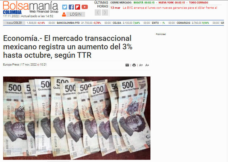 Economía.- El mercado transaccional mexicano registra un aumento del 3% hasta octubre, según TTR