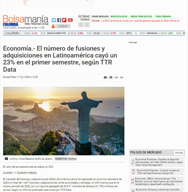 El mercado de fusiones y adquisiciones (M&A) de América Latina ha registrado en el primer semestre de 2023 un total de 1.447 fusiones y adquisiciones, entre anunciadas y cerradas, un 23% menos que en el mismo periodo de 2022, por un importe agregado de 35.671 millones de dólares (31.752 millones de euros), según un informe publicado este lunes por TTR Data.