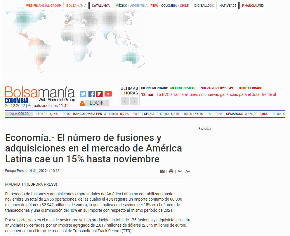 El mercado de fusiones y adquisiciones empresariales de América Latina ha contabilizado hasta noviembre un total de 2.955 operaciones, de las cuales el 45% registra un importe conjunto de 88.308 millones de dólares (82.942 millones de euros), lo que implica un descenso del 15% en el número de transacciones y una disminución del 40% en su importe con respecto al mismo período de 2021.