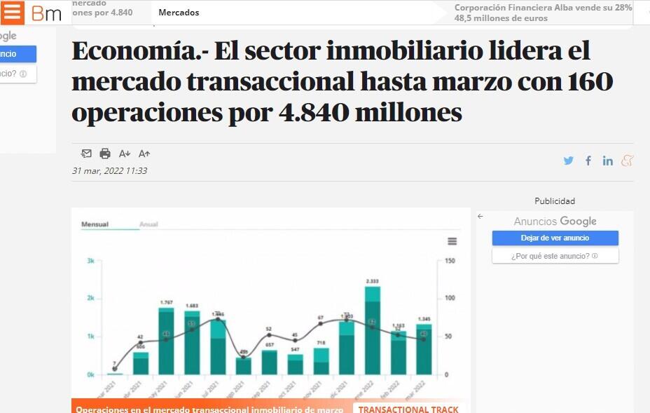 Economía.- El sector inmobiliario lidera el mercado transaccional hasta marzo con 160 operaciones por 4.840 millones